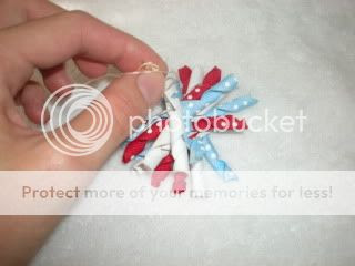 Pull all the korker pieces down to the knot all at once. Then string the ribbon back through the middle making sure not to go through the same hole. It's actually easier to hold the ribbons, pinching the middle while doing this last step. I just couldn't do it that way while taking the picture.